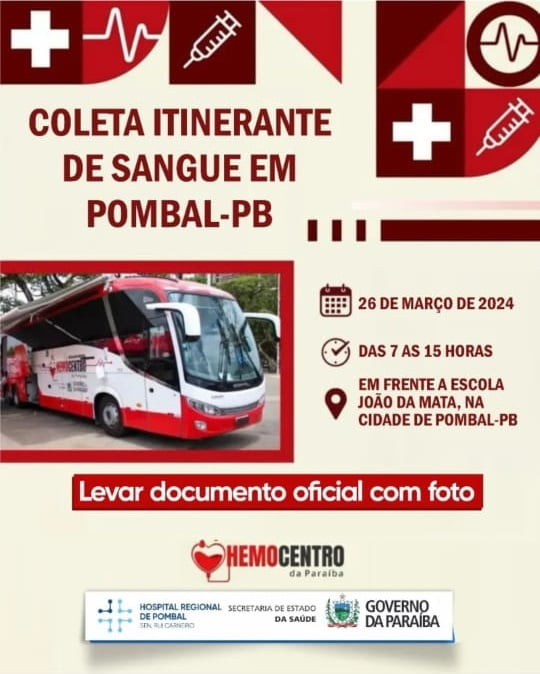 Nesta terça-feira (26/03/2024), será realizada na cidade de Pombal no Sertão da Paraíba, uma coleta itinerante de sangue.
