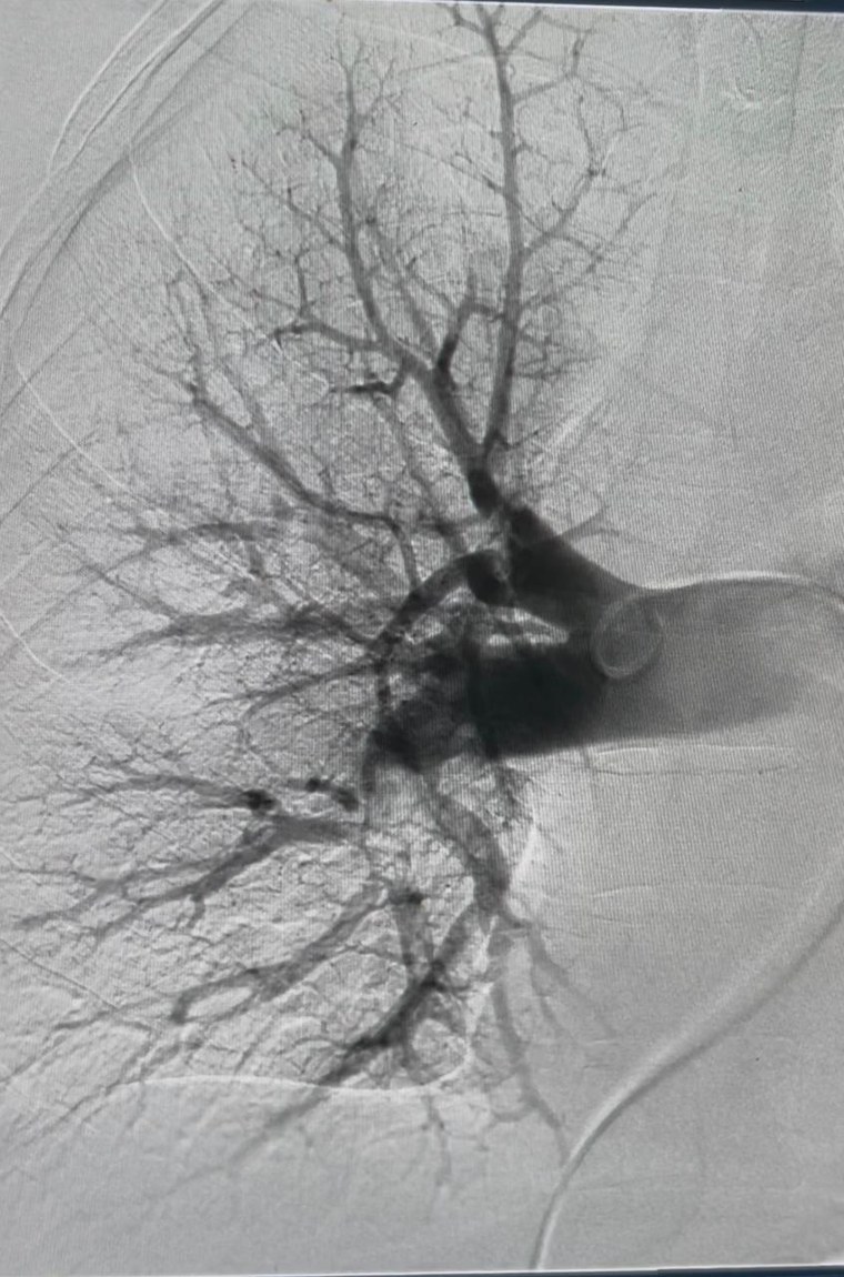 Isaac deu entrada na unidade com queixa de dor respiratória e, após avaliação clínica e exames de imagem, foi confirmada a presença de um coágulo de grandes proporções obstruindo a circulação nos vasos do pulmão. A obstrução comprometia o fluxo sanguíneo adequado, o que levou à indicação imediata da trombectomia mecânica pulmonar.